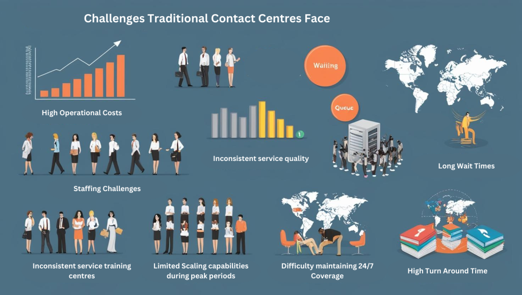 Today’s contact centers face unprecedented challenges that impact both operational efficiency and customer satisfaction. The traditional model, while familiar, comes with significant drawbacks: Operational Inefficiencies: